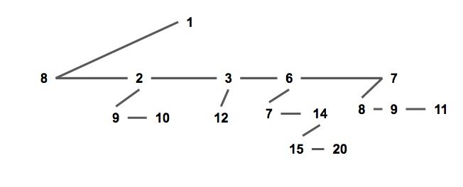 通常我们使用儿子 - 兄弟表示法储存一个配对堆(如下图),一个节点的所有儿子节点形成一个单向链表。每个节点储存第一个儿子的指针,即链表的头节点;和他的右兄弟的指针。