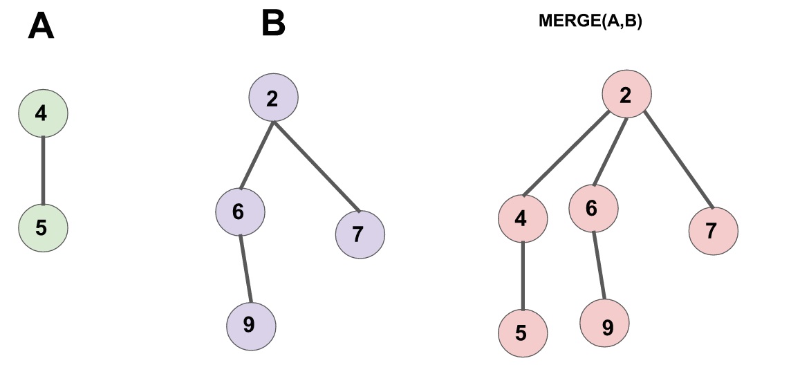 合并两个配对堆的操作很简单,首先令两个根节点较小的一个为新的根节点,然后将较大的根节点作为它的儿子插入进去。(见下图)