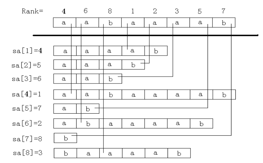 height[i]=lcp(sa[i],sa[i−1]),即第 i 名的后缀与它前一名的后缀的最长公共前缀。