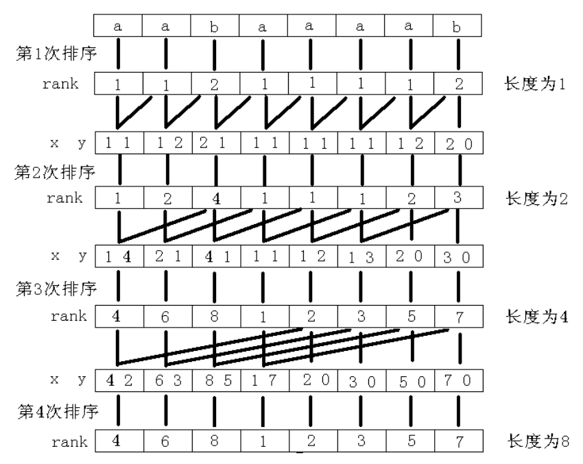 思考一下第二关键字排序的实质,其实就是把超出字符串范围(即 sa[i]+w>n)的 sa[i] 放到 sa 数组头部,然后把剩下的依原顺序放入: