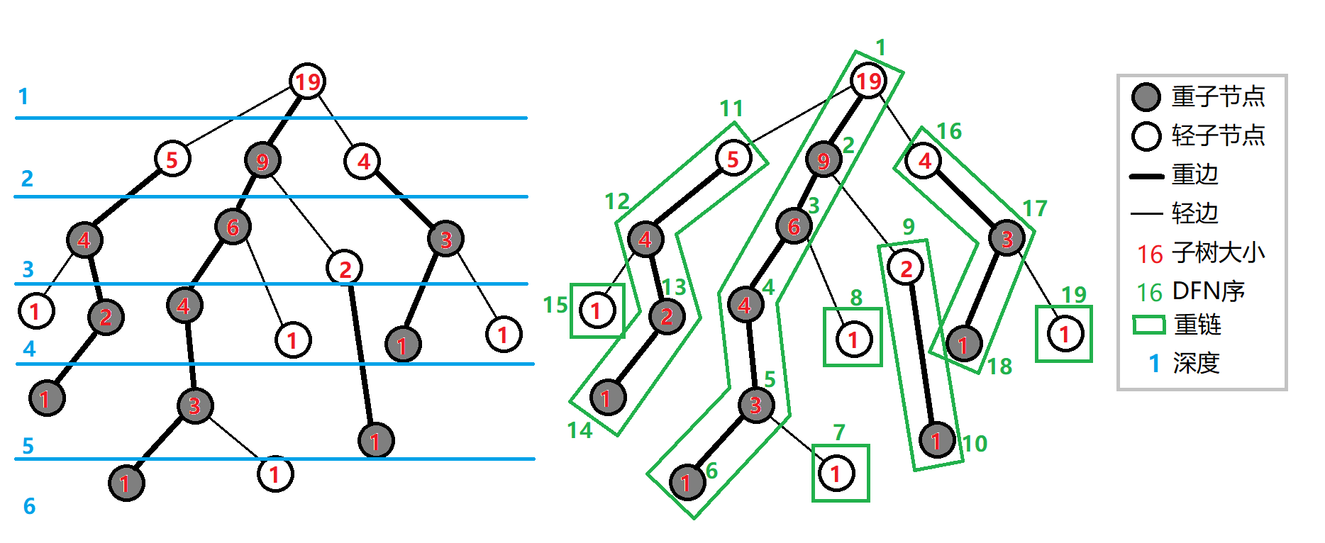 重链剖分可以将树上的任意一条路径划分成不超过 条连续的链,每条链上的点深度互不相同(即是自底向上的一条链,链上所有点的 LCA 为链的一个端点)。