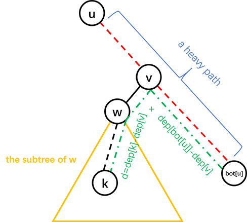假设我们需要在子树 中找结点 所在的位置,我们可以询问 与 所在重链的尾端的距离,就可以进一步确定 的位置,具体见图: