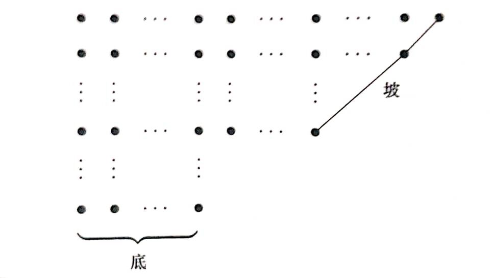 画出每个互异分拆的 Ferrers 图。最后一行称为这个图的底,底上点的个数记为 (Bottom);连接最上面一行的最后一个点与图中某点的最长 度角线段,称为这个图的坡,坡上点的个数记为 (Slide)。
